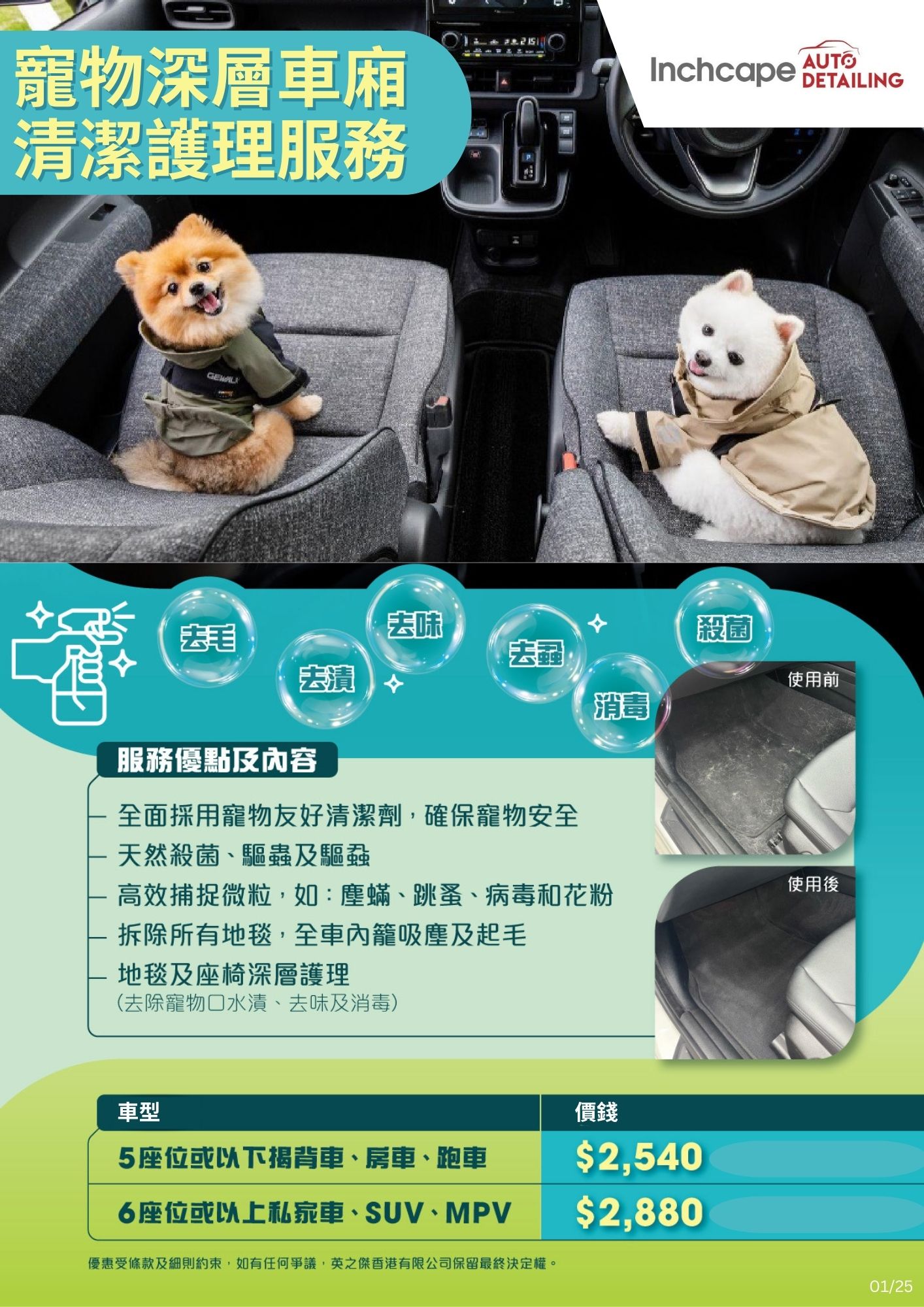 「Inchcape Auto Detailing - 全方位汽車美容護理及配件專家」推出寵物深層車廂清潔護理服務,高效去毛、去漬、去味、去蝨、殺菌、消毒,體驗價只需$2,540起,請即聯繫我們了解詳情!